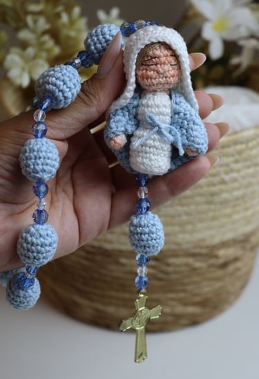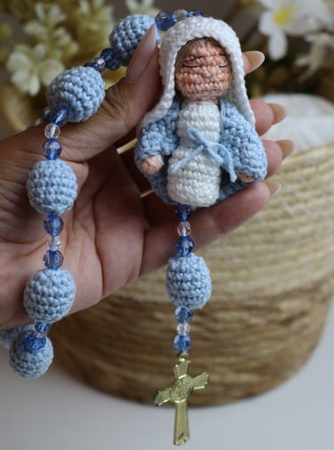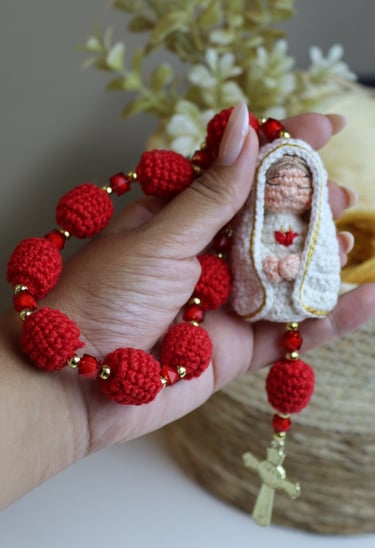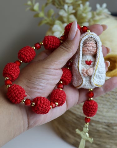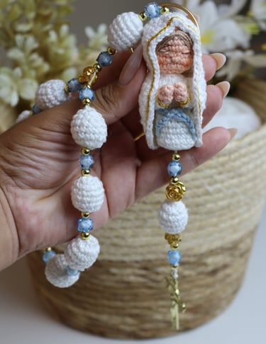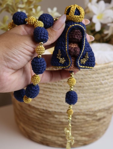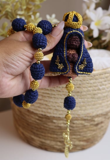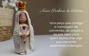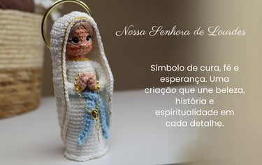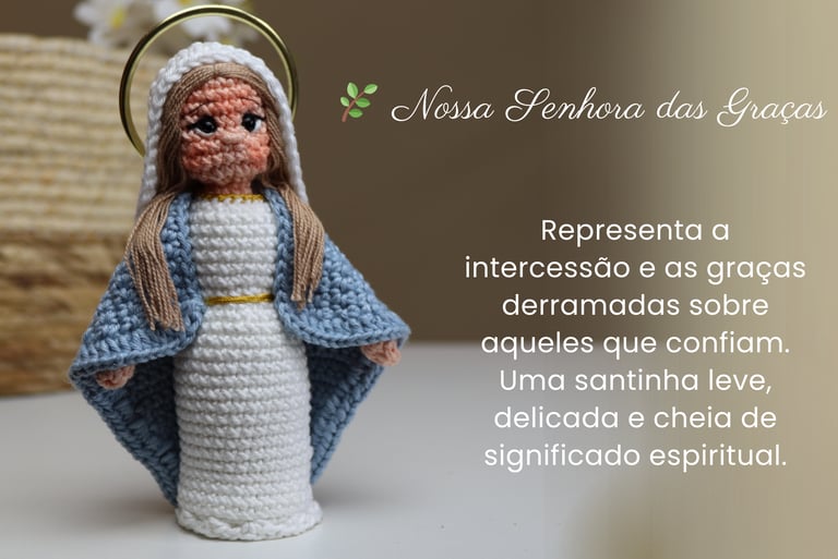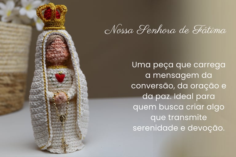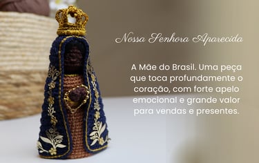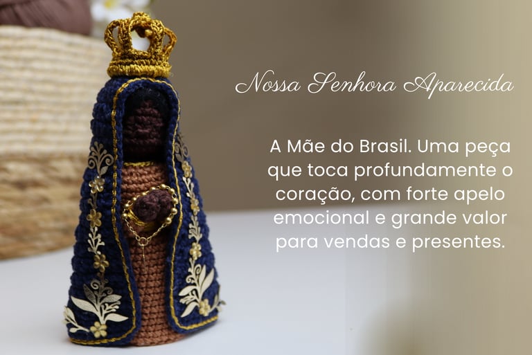 No curso, você também vai aprender a fazer tercinhos em amigurumi que acompanham cada Nossa Senhora — formando conjuntos sofisticados, delicados e cheios de significado.